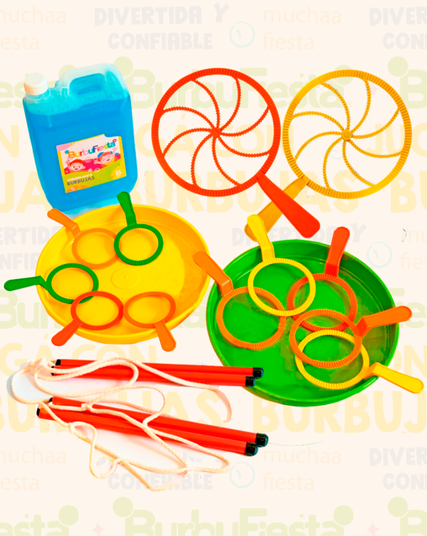 Kit compuesto por: 2 Litros de líquido para burbujas, 5 Burbujeros de 6cm, 5 de 8cm, 2 Burbujeros Hélice, 1 Maxy, 1 Multi y 2 Bandejas de 22cm.